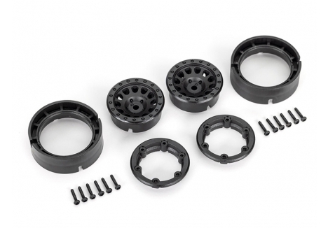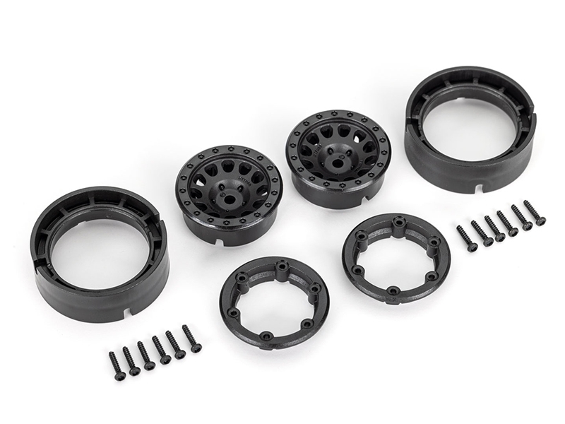 Functional Method Race Wheels 105 beadlock wheels look great on your TRX-4M and provide maximum grip on the tyre bead. Beadlock wheels work with standard TRX-4M tyres and the optional 9782 Mickey Thompson Baja Pro X off-road tyres. Add the optional 9780 brass wheel weights to give your TRX-4M even more stability for tough technical maneuvers. Includes inner and outer rims (2), centre barrels (2), and 1.6x10 mm self-tapping screws (12).
