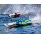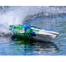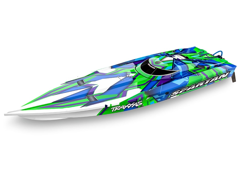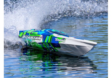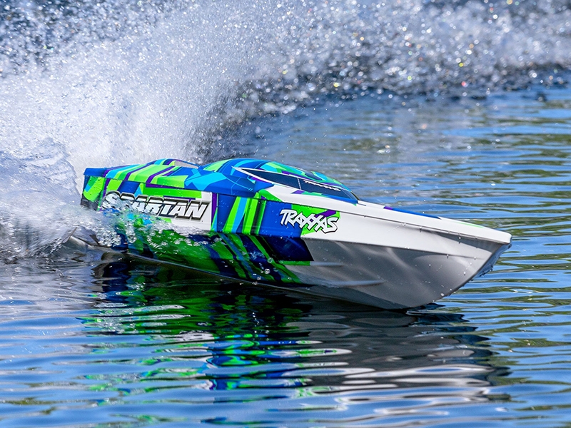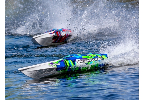 Spartan is the kind of boat you expect from Traxxas. Its 50+mph fury makes even the most insatiable, power-hungry enthusiasts jump up and take notice. Spartan means business with its super-rigid, 36-inch deep-V hull, smooth, cable-drive efficiency, innovative water cooling system, and precision aluminum and stainless steel drive controls. The clean, modern hull design is built up in layers for maximum rigidity and its bold new paint makes a statement on the water. The integrated battery trays secure a wide variety of battery packs from 8.4V NiMH batteries all the way up to 8400mAh 3s LiPo packs. A high-output TQi 2.4GHz radio with the innovative Traxxas Stability Management (TSM) system keeps Spartan under complete control as it slices through the water. Spartan delivers the power, speed, convenience, and fun for which Traxxas' award-winning cars and trucks are known. Prepare yourself for the ultimate RC boating power trip, only from Traxxas.