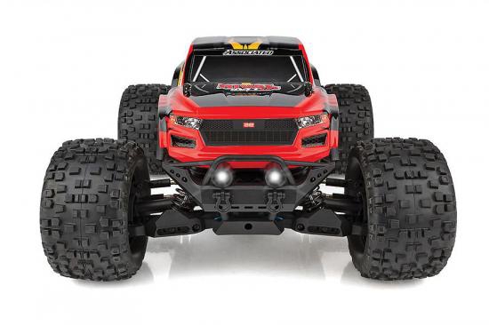 The LED-equipped components of the affordable Team Associated AS20518 truck with LED bumper and centre differential add a layer of functionality and style to the truck’s design. The front bumper features integrated LEDs that illuminate the path ahead, improving visibility during dusk or night-time runs. The rear wheelie bar also includes LED lighting, enhancing the truck’s visual presence and making it easier to track during high-speed passes. These lighting elements are securely mounted and designed to withstand vibration and impact, ensuring long-term reliability. The factory-finished red body shell complements the LED accents, giving the RIVAL MT10 V2 a bold and aggressive look that stands out on any terrain.