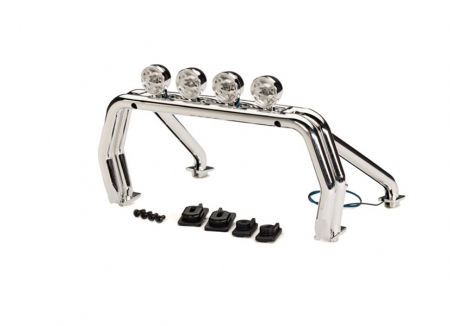 Add more scale detail to your TRX-4 Chevrolet K10 or Ford F-150 pickup body with this chrome roll bar with working LED lights. Includes left and right mounts and 2.6 mm screws (4). (requires 9212-series K10 or 9230-series F-150 body with LED light kit installed)