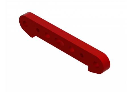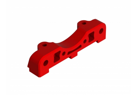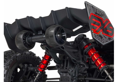 The ARRMA KRATON brushless truck with aluminium chassis and oil-filled shocks features a 5mm thick laser-etched EXB 7075-T6 aluminium plate that forms the backbone of its rugged structure. Reinforced with red-anodized CNC aluminium front brace mounts and composite side pods, the chassis resists flex and absorbs impact. A multi-structured center brace system adds rigidity, while the center body support prevents shell deformation during hard landings. This chassis layout ensures the KRATON remains stable and responsive, even under extreme bashing conditions.