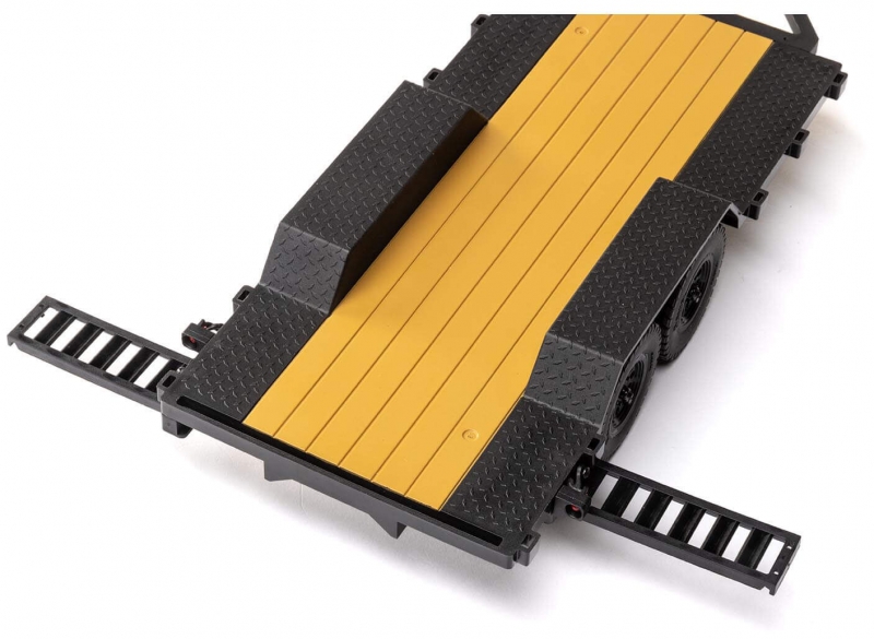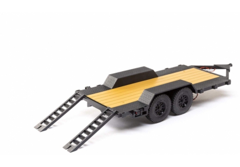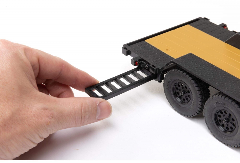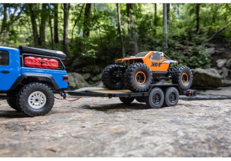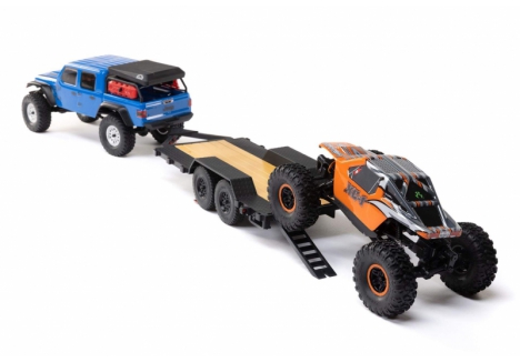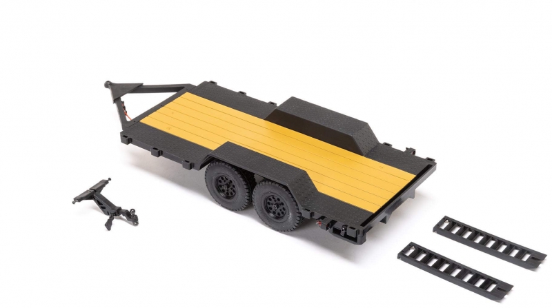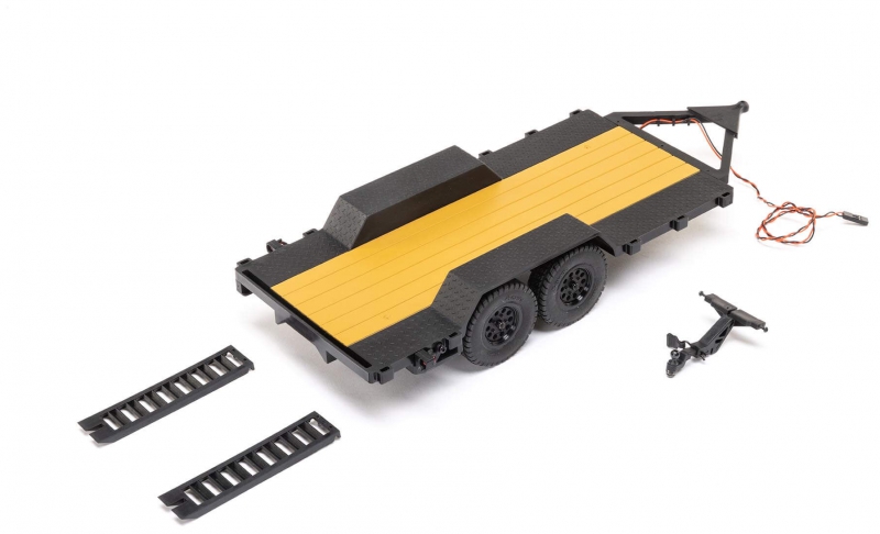 Hitch up the Axial SCX24 Flat Bed Vehicle Trailer to your SCX24 and tow that AX24 crawler to the trail! This is the ultimate functional accessory for 1/24 scale RC rigs - ready to use and complete with hitch, working LED lights, and hide-away ramps.