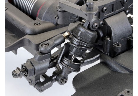Oil filled shock absorbers, anti-roll bars and adjustable double wishbone suspension lets you tweak to suit your settings and tyre choice; either treaded rubber tyres for street racing, featuring 25mm wide front and 30mm wide rear for better stability at high speed or hard plastic boots on 6-spoke wheels for sideways drift driving.