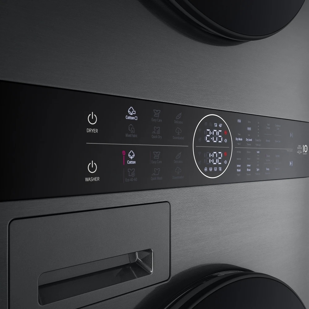 A unified control panel with full touch buttons and LED display keeps LG WT1210BBTN1 WashTower Platinum Black 12kg Washer 10kg Dryer easy to operate, even during busy routines. Clear figure indicators, door lock status, and end-of-cycle signals help you manage tasks efficiently, while remote features let you start, monitor, and adjust cycles on the go. The stacked design simplifies movement between wash and dry, and smart pairing coordinates settings to reduce manual steps. Combined, these elements make daily laundry more streamlined and less time-consuming.
