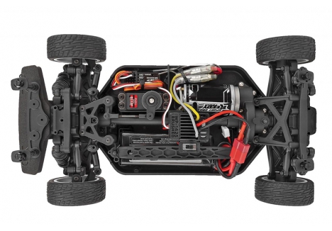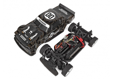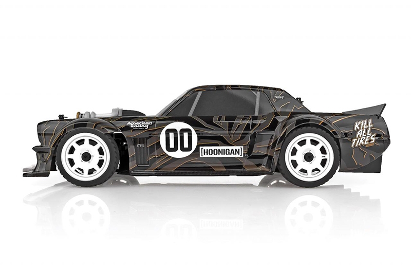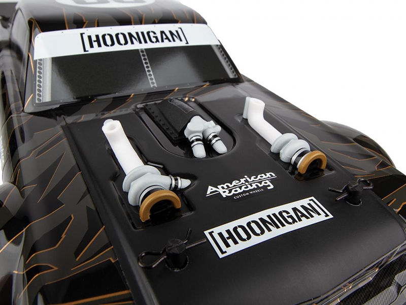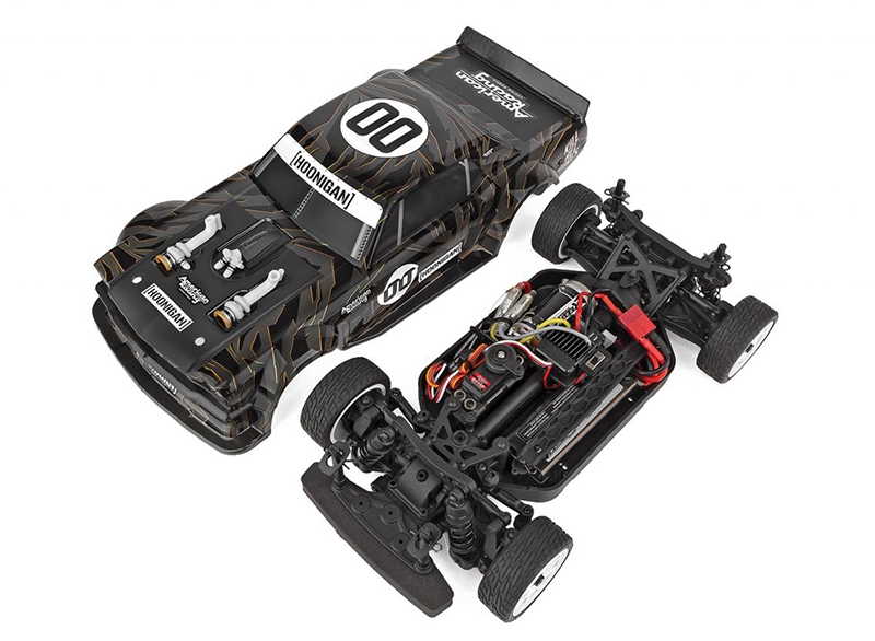The Reflex 14R chassis has been updated from our previous version with the latest features in on-road racing. Sealed front and rear gear differentials, a molded tub chassis with covered center driveshaft, and adjustable shock positions--these extra features make it a perfect platform for the Hoonicorn's tire-slaying action!