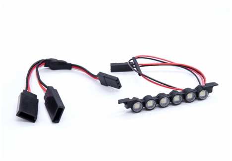 Light up your trail with this 6 x bright LED Spot light bar. The Spot lights are 7mm in diameter with fitted pattern lens. Designed with side lugs to mount between the roof bars on the TRX-4m Bronco with with no screws required. These side lugs can be drilled so fitting to any vehicle is possible. A small hole is required in the body for the power lead to connect to the receiver or power source. Packed in a slim clear plastic box to protect the bar and includes a servo 'y' lead for easy fitting.