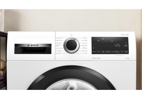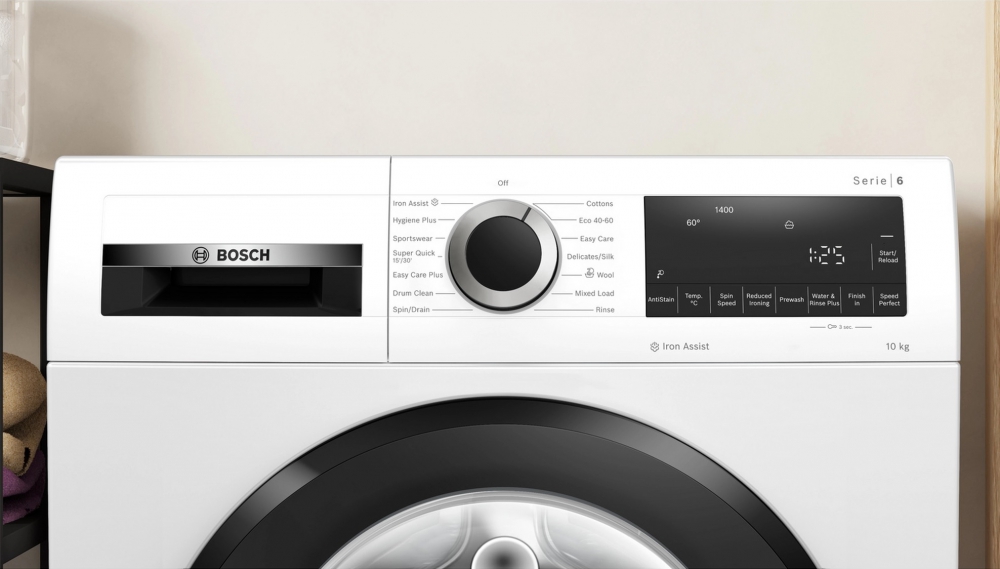 This bosch freestanding washing machine 10kg features an advanced AntiStain system capable of tackling four of the most common stubborn stains, including red wine and oil. The steam-assisted Iron Assist reduces wrinkles and simplifies ironing, helping clothes stay in better condition for longer. The specialised drum design with wave technology gently cares for fabrics, making it safe for even delicate loads. Its range of custom programmes allows you to tailor each wash to your specific needs, from mixed loads to sportswear.