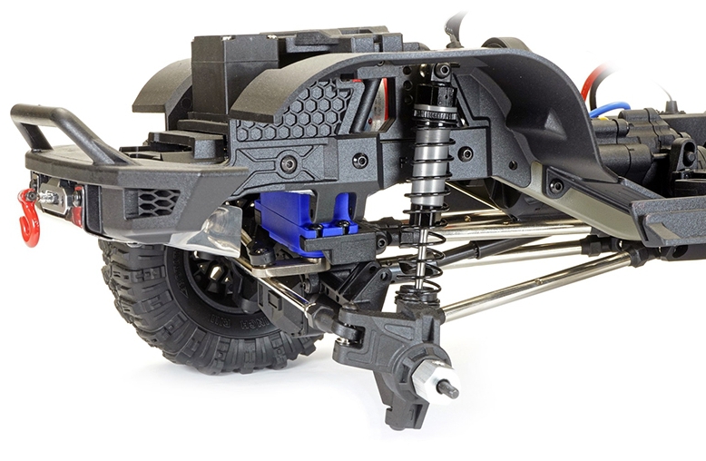 The scale front bumper accommodates a winch cable and hook protected by a stamped aluminium lower skid plate. The cable can be extended up to 90cm via a 25kg MG 360° winch servo.