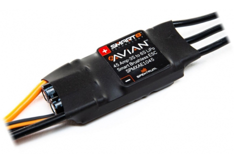 The Spektrum™ Avian™Smart 45 amp ESC transmits Smart Battery and ESC data straight to your Spektrum Transmitter all over one wire. An Avian electronic speed control provides a one-wire solution for obtaining telemetry data such as current, voltage, cell balance, temperature and RPM. The Avian ESC 32-bit M4 processor produces higher resolution signal input and more accurate motor output for a locked in and active throttle response.
