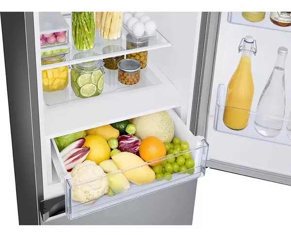 Organisation is simplified with the Big Door Bin in the Samsung RB34C600ESA bottom mounted freezer. This wider and deeper shelf accommodates bottles and cartons up to 4 pints, freeing up space on the main shelves for other items. The thoughtful design allows users to stock up on drinks and dairy products without cluttering the interior. Combined with three tempered glass shelves and a vegetable drawer, the layout supports efficient storage and easy access.
