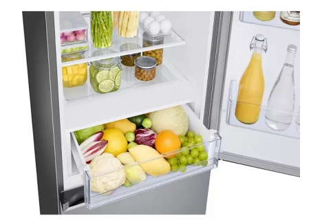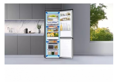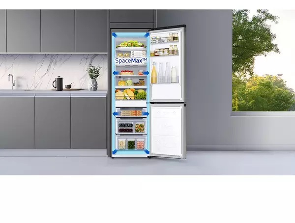 The Samsung RB34C600ESA bottom mounted freezer with 344L capacity and frost free cooling features SpaceMax technology, which uses thinner insulation walls to increase internal volume without altering the external footprint. This innovation allows users to store more food while maintaining a standard 595mm width, making it ideal for kitchens with limited space. The 230L fridge and 114L freezer compartments are thoughtfully arranged to optimise shelf and drawer space, ensuring that everything from weekly groceries to party platters fits comfortably.