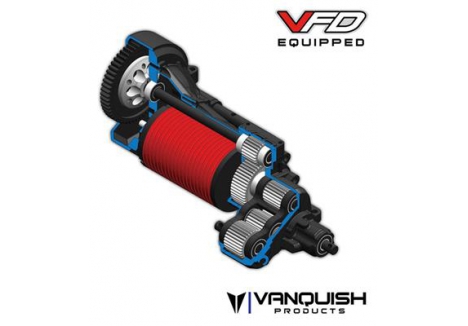 VFD Transmission is designed to provide an optimal balance of performance, scale appearance, strength and versatile optional accessories. The VFD’s design places the motor forward and as low as possible to keep the weight where you want it. Out of the box the VFD Spec transmission provides a 6.5% overdrive to provide better turning and climbing performance without taxing your electronics. The T-case utilizes unique replaceable bearing plates to provide adjustable bearing positioning. The modular design of the bearing plates allow for optional gear ratios used to be used inside the T-case. The VFD transmission is compatible with 540 brushed and brushless motors*