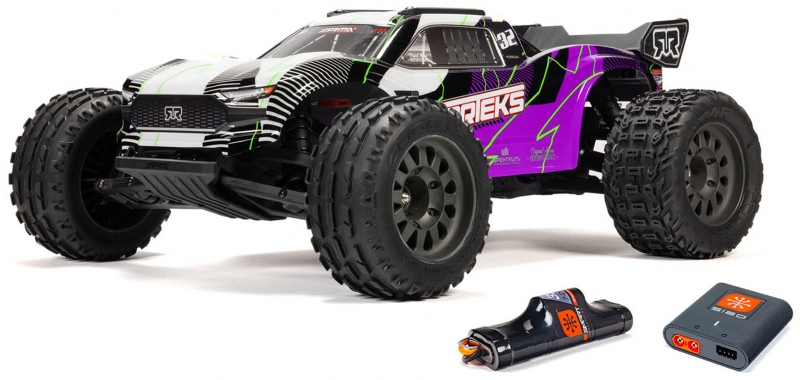 The ARRMA purple RC truck with waterproof Spektrum SLT2 electronics comes fully equipped with everything needed to hit the ground running. Inside the box, you'll find the factory-assembled stadium truck, Spektrum SLT2 2.4GHz transmitter, Spektrum S660 waterproof digital steering servo, and a Spektrum Smart 7-cell 3300mAh NiMH battery with IC3 connector. Charging is handled by the Spektrum S120 USB-C Smart Charger, which automates the process for safe and efficient power delivery. Also included are four AA transmitter batteries and high-quality molded hand tools. With no additional purchases required, the ARRMA beginner RC car with bottom-loading battery tray and mesh-safe transmission is ready for action straight out of the box.