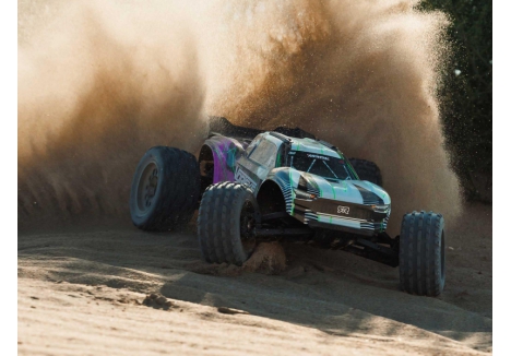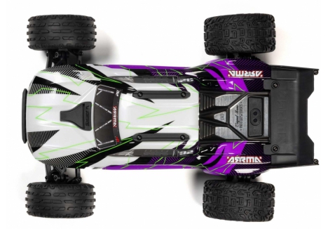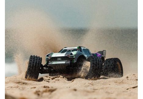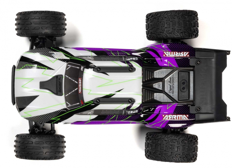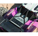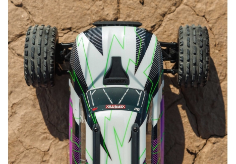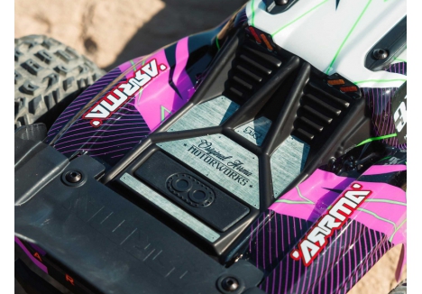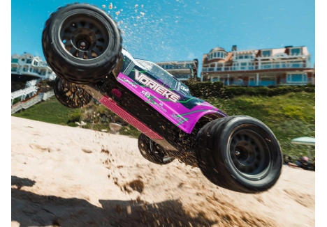 The ARRMA VORTEKS C-ARA3205ST2 features a low-profile stadium truck body that enhances aerodynamics and visual appeal. The body is securely held in place by a hidden retention system, preserving the sleek look while allowing quick access for maintenance. Color-matched wheels and bumpers complement the bold purple finish, while the coilover suspension and multi-spoke wheels reinforce the truck’s rugged build. Whether you're racing through turns or blasting over bumps, the ARRMA electric stadium truck with Smart battery and charger C-ARA3205ST2 ensures you look as good as you drive.