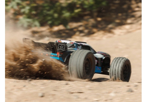 The ARRMA VORTEKS MEGA 550 blue truck with dBoots Dirtrunner ST tires and composite chassis incorporates a hidden body retention system that secures the stadium truck’s shell without visible clips. This design not only enhances the truck’s visual appeal but also simplifies access to internal components. When maintenance or upgrades are needed, users can remove the body quickly and cleanly. The low-profile stadium truck body complements the chassis layout, contributing to aerodynamic performance and a sleek appearance. This combination of form and function reflects ARRMA’s commitment to delivering RC vehicles that are both practical and visually striking.