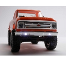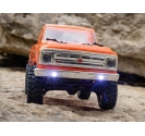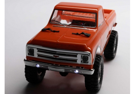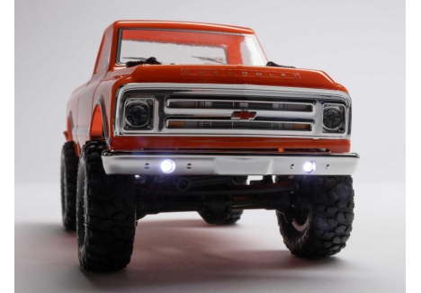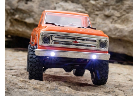 Mounted in the front bumper, the LED lights on the Axial SCX24 orange Chevy C10 4WD RTR crawler with battery and charger enhance visibility during low-light crawling sessions. These bright LEDs illuminate the path ahead, making it easier to navigate obstacles and maintain orientation in dim environments. An additional LED port on the ESC allows users to expand the lighting setup with optional accessories, further customizing the crawler for nighttime use. This feature adds both functional value and visual appeal, making the crawler suitable for a wider range of conditions and enhancing the overall experience.