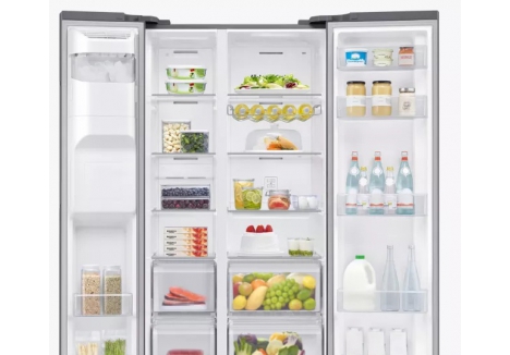 This side by side fridge freezer with water dispenser is a centrepiece in any stylish kitchen. It features Samsung’s refined inox silver finish, a minimalist external display, and flat doors that maintain a clean visual flow with cabinetry. Inside, All-Around Cooling evenly distributes cold air, so each section stays at optimum temperature. The flat duct design eliminates dead zones, ensuring your produce remains evenly chilled without compromising on space.