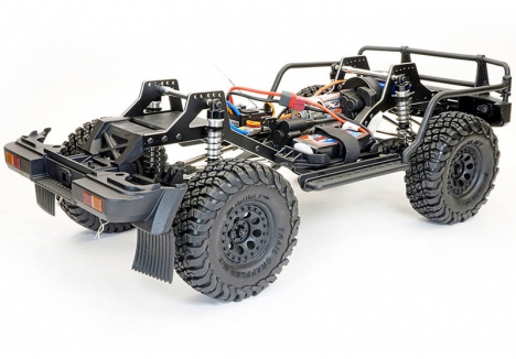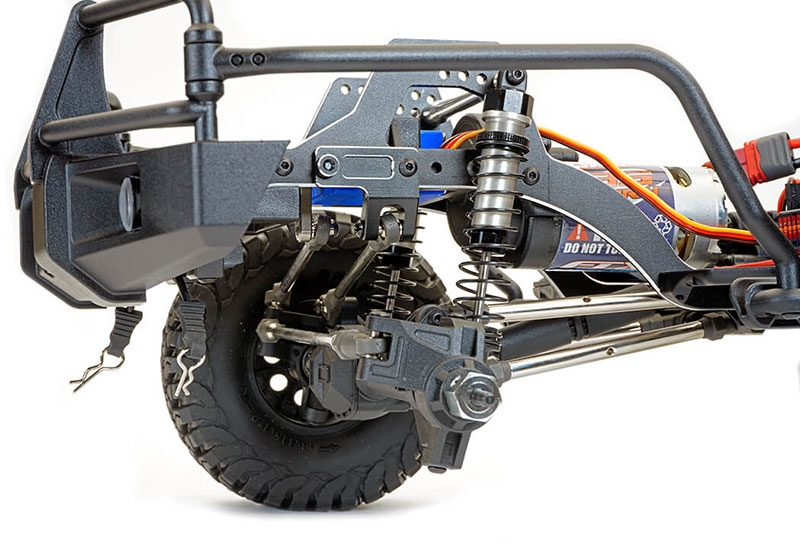 Underneath the Trooper a CNC machined LCG chassis holds a compact single speed gearbox and split transmission mounted as low as possible. Reverse transmission helps counter torque twist effect. A 3-link with Panhard bar set-up is featured at the front with traditional 4-link rear all controlled by aluminium oil filled shock absorbers. Straight axles front and rear house spiral cut drive and pinion gears, with the front using heavy-duty universal driveshafts.