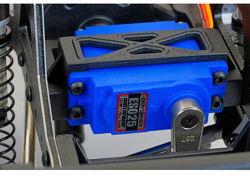 - Servo: Etronix 25kg waterproof metal geared steering servo for high-torque control