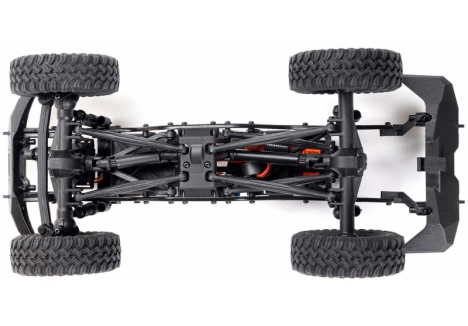 At the heart of the Axial SCX24 Base Camp with 030 brushed motor and 4-link rear suspension C-AXI-1219T3 is a Dynamite 88T 030-size brushed motor, mounted securely to a stamped aluminum plate to reduce flex and protect the gears. This motor delivers the torque necessary for steep climbs and technical crawling. The drivetrain is supported by full ball bearings, eliminating bushings and ensuring smooth rotation across all components. MOD-0.3 gear pitch and a 55T spur gear balance speed and torque, while the 10T pinion gear complements the motor’s output. Together, these elements create a drivetrain that’s both efficient and upgrade-ready.