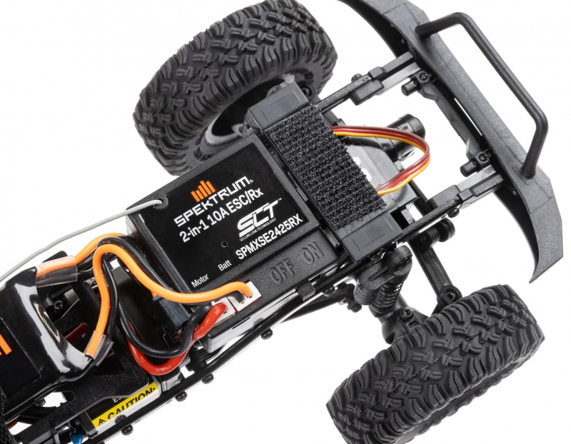 The Axial SCX24 Base Camp includes a Spektrum SLT2 2.4GHz radio system with advanced features like throttle limiting and steering travel adjustment. Paired with a Spektrum 10A brushed ESC/receiver combo, the electronics deliver precise control and responsive handling. The included Spektrum 350mAh LiPo battery provides reliable power for extended crawling sessions, and the USB charger ensures convenient recharging. Water-resistant electronics allow the crawler to operate in damp conditions, expanding its usability across indoor and outdoor environments. The Axial AS-1 micro servo completes the control system, offering accurate steering input for navigating complex terrain.