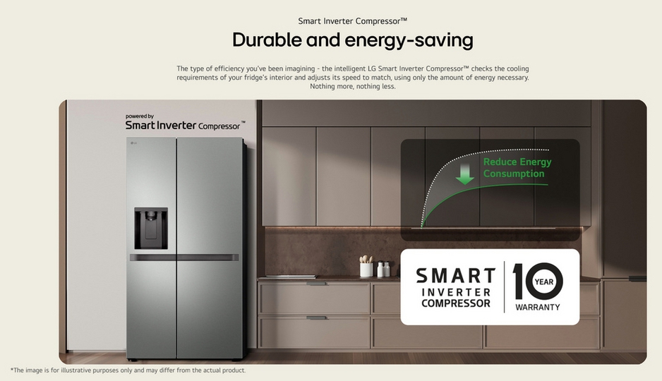 The LG Smart Inverter Compressor intelligently adjusts its speed based on cooling demand. This reduces energy consumption, minimises noise and extends the appliance’s lifespan. With an annual energy usage of 347 kWh and an E rating, the GSLC40PYPE balances performance with efficiency. The compressor is backed by a 10-year parts warranty for added peace of mind.