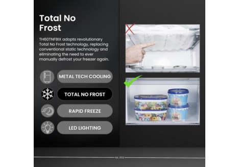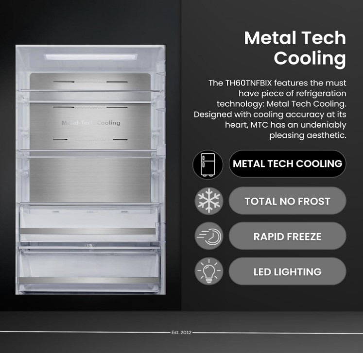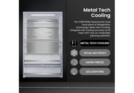 The Teknix TH60TNFBIX freezer with metal tech cooling incorporates a precision-engineered metal panel that enhances internal air circulation and cooling accuracy. This feature not only contributes to a visually refined interior but also ensures that cold air is evenly distributed throughout the cavity. As a result, temperature fluctuations are minimised, and food is preserved more effectively. Metal Tech Cooling is especially beneficial for households that store a wide variety of items, from frozen vegetables to delicate desserts.