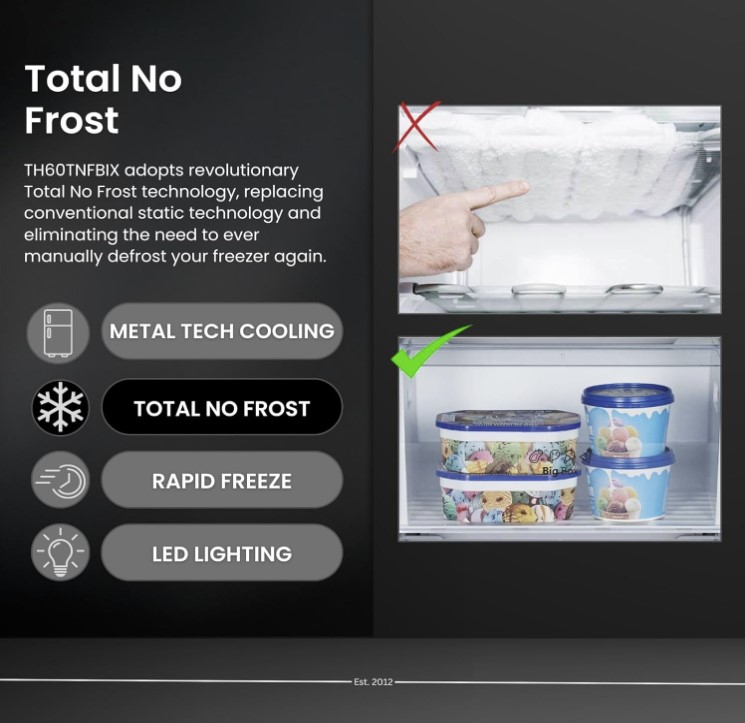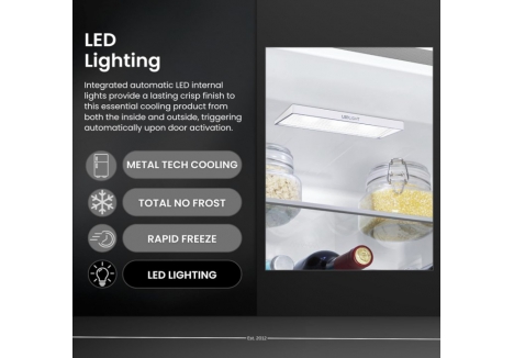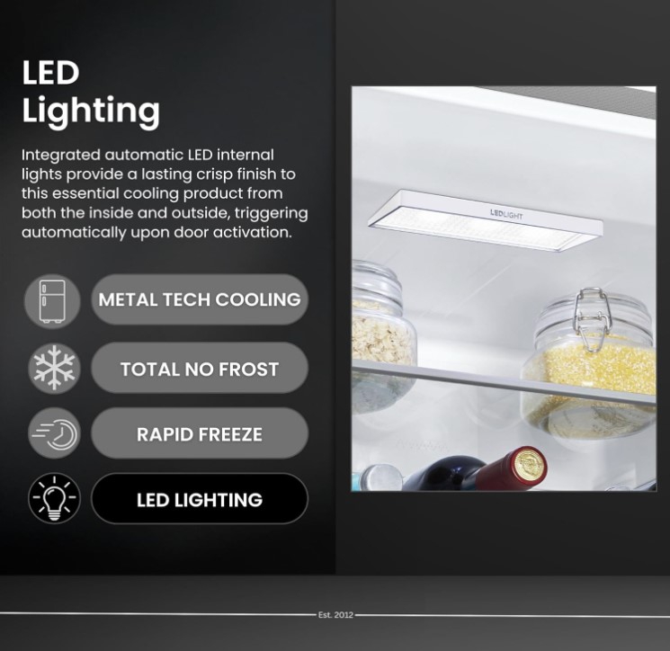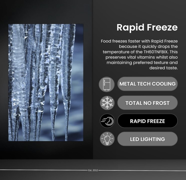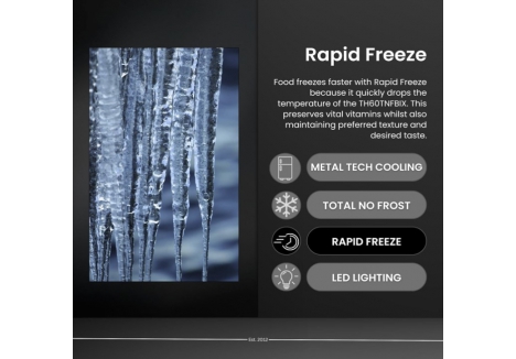 Yes. The Teknix TH60TNFBIX with rapid freeze and LED lighting is designed to accelerate the freezing process, locking in vital nutrients and maintaining food texture. Rapid Freeze technology drops the internal temperature quickly, which is ideal for newly added items that need immediate preservation. Complementing this is the integrated LED lighting system, which activates automatically when the door opens, providing bright, energy-efficient illumination that makes it easy to locate items without increasing internal heat.