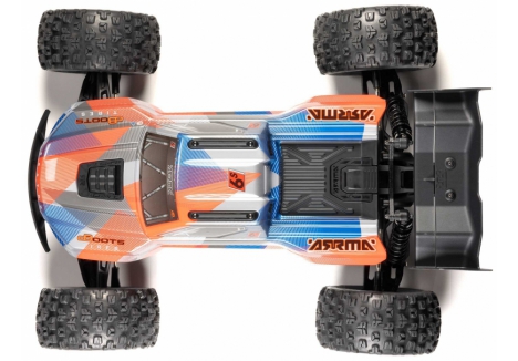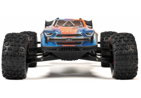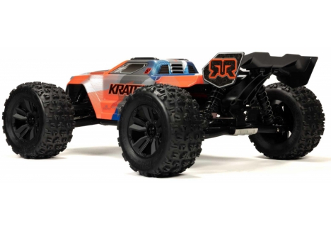 The ARRMA RC car with clipless body and SLT3 transmitter features a quick-release body retention system that eliminates traditional body clips. This design streamlines access to internal components for battery swaps and maintenance, while also adding structural protection against punch-through during crashes. The iconic KRATON body, finished in a bold orange multi-color scheme, complements the truck’s aggressive stance and includes a high-downforce wing mounted on an EXB-reinforced bracket. This combination of form and function ensures the ARRMA C-ARA8608V6T1 brushless monster truck looks bold and performs with practical efficiency, especially during frequent stunt sessions.