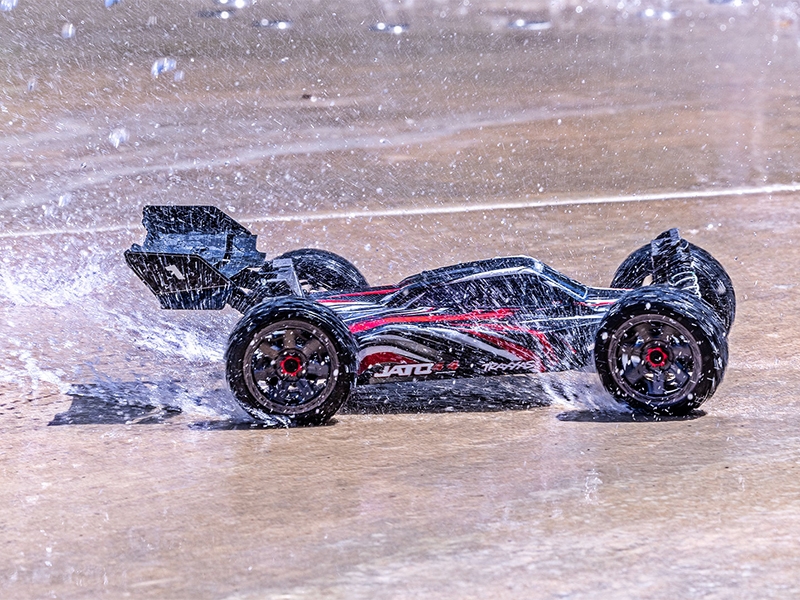 Factory-installed Extreme Heavy Duty Upgrade components give Jato 4X4 the superior strength and durability normally associated with Traxxas’ toughest off-road trucks. An ultra-rigid T-Bar reinforces the chassis with Extreme HD shock towers to support the suspension. Huge Maxx-Duty® driveshafts transfer every ounce of the motor’s torque to the wheels with unsurpassed strength.