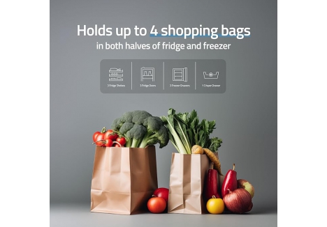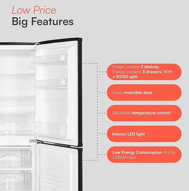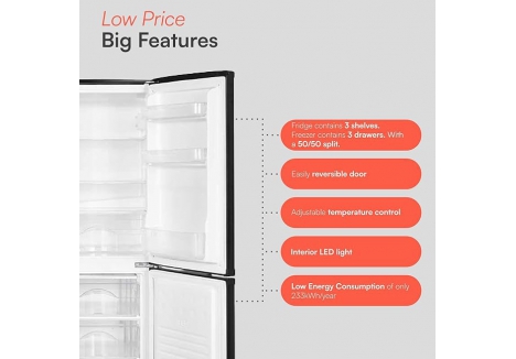 The perfect balance between cooling and freezing, the 50/50 freestanding fridge freezer is equal in size and space. The black fridge freezer is controlled by a electronic board with an easy to use dial to assure the guarantee of precise temperatures to provide great preservation for the freshness of your food. The top half is the fridge and the bottom half is the freezer, the fridge comes with adjustable glass shelves which you can move up and down to allow space for different size containers or bottles, it also comes with a salad drawer which has been designed to retain humidity for the best kept fresh vegetables and fruit. The freezer comes with 3 draws, 2 the same size and the bottom one a little bit deeper, allowing space for your meats for Christmas. Integrated into the Fridge is a money saving LED Light, which flicks on and off when you open the doors. This is the perfect size fridge freezer for families with 4 or more, plenty of space to keep your food to feed your family.