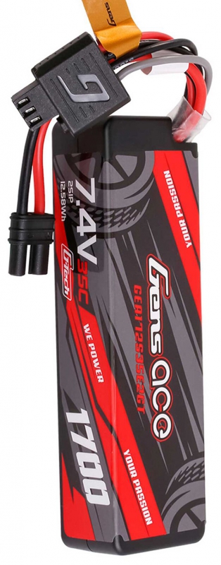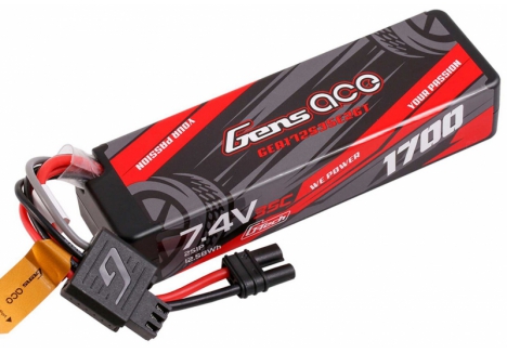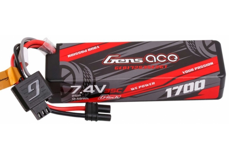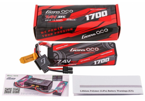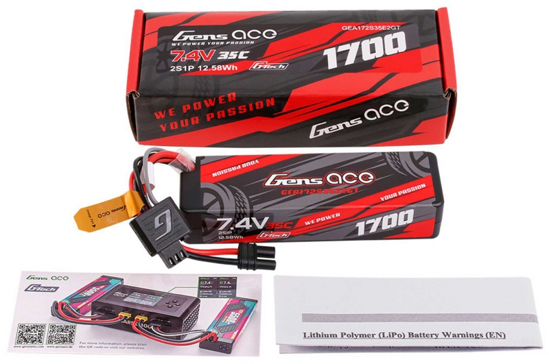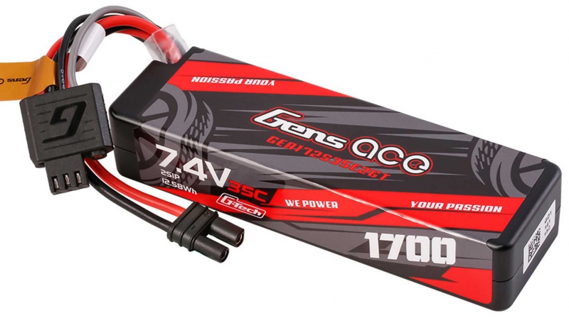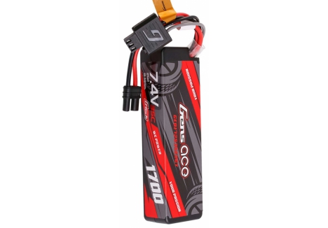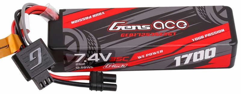 Gens ace G-tech 1700mAh 7.4V 35C 2S HardCase 141# Car Lipo Battery Pack with a patented iEC2 plug, specifically designed for the Arrma Grom Series and other mini scale vehicles.
