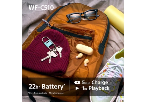 Designed for portability, the Sony WFC510W.CE7 wireless headphones come with a cylindrical charging case that fits easily into pockets or bags. The case features a tactile, textured surface that enhances grip and visual appeal. With up to 22 hours of total battery life—11 hours from the earbuds and an additional 11 hours from the case—users can enjoy uninterrupted audio throughout the day. A quick 5-minute charge provides an extra hour of playback, ensuring the Sony compact lightweight earbuds are always ready when needed.