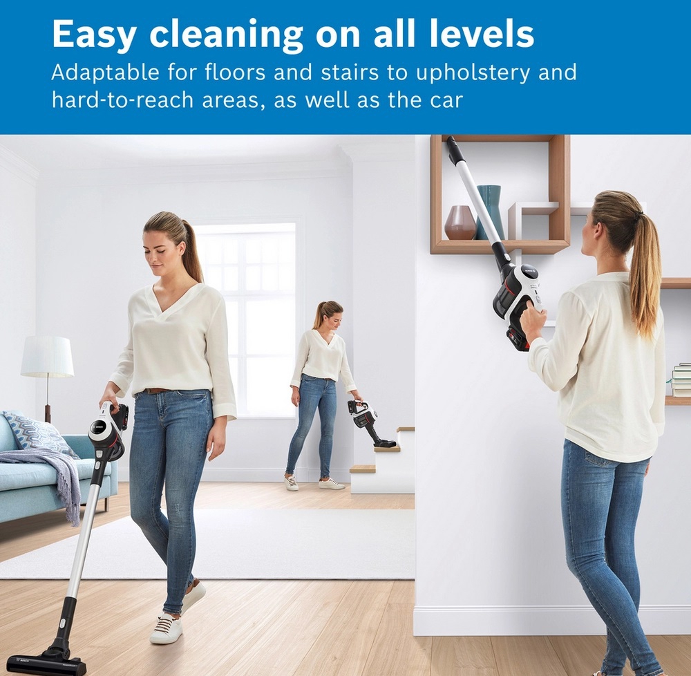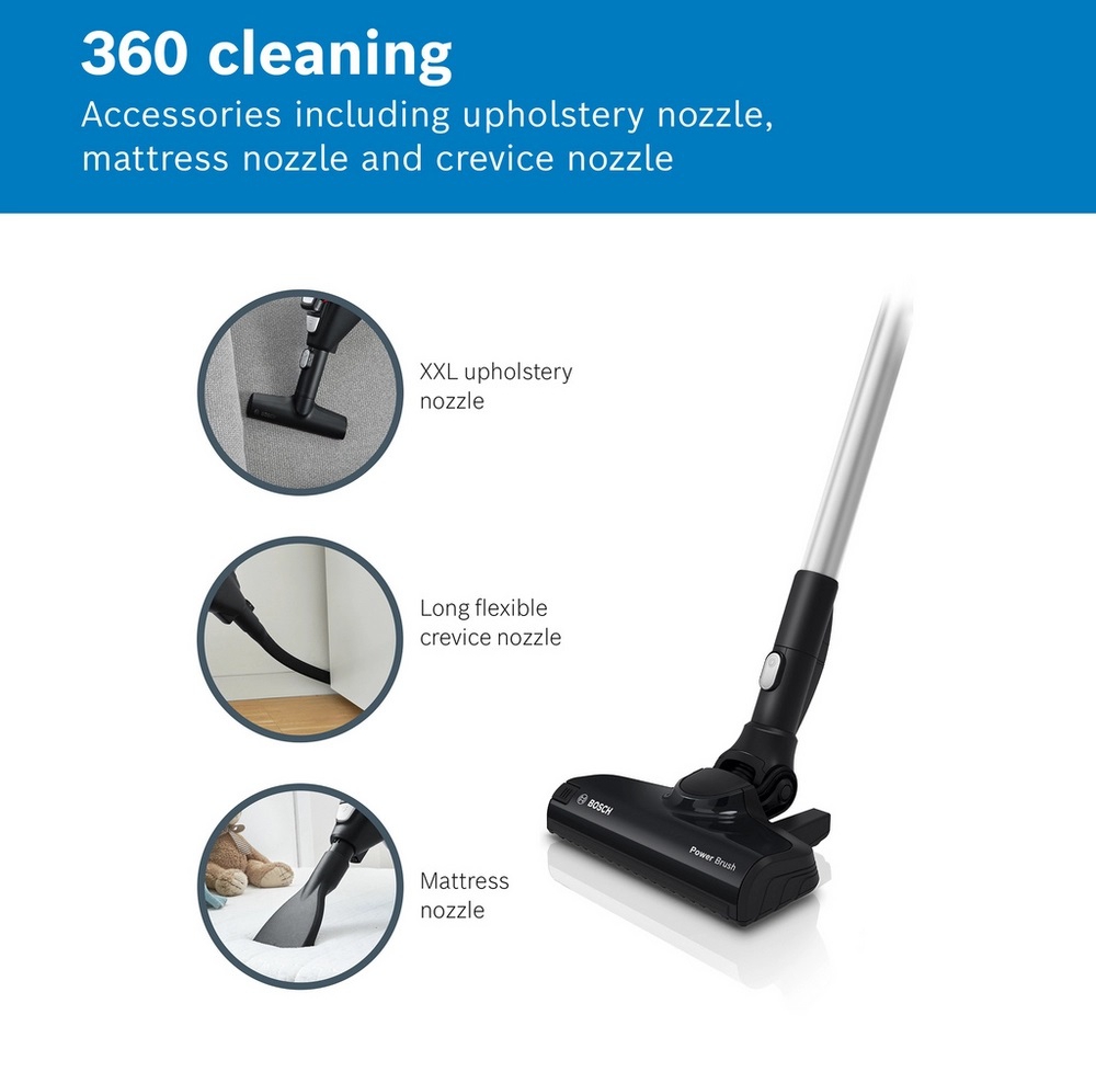 The Bosch cordless vacuum with crevice nozzle and chrome tube is designed for targeted cleaning in hard-to-reach areas. The slim crevice nozzle is perfect for corners, edges, and narrow gaps, while the chrome tube extends your reach to ceilings, curtain rails, and behind furniture. This setup allows users to clean areas that traditional vacuums struggle to access, making the Bosch BCS612GBKIT a versatile tool for whole-home maintenance. Whether you're dusting high shelves or removing debris from tight spaces, this vacuum provides the reach and control needed for thorough results.