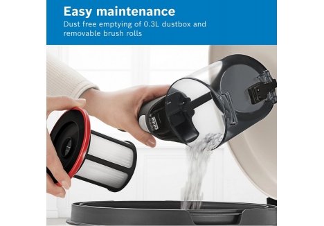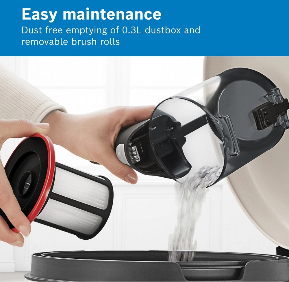 The Bosch BCS612GBKIT bagless stick vacuum with extra battery is engineered to streamline your cleaning routine. With a maximum runtime of 30 minutes and a 4-hour charge time, this cordless vacuum is ideal for both quick cleanups and full-room sessions. The included additional battery pack ensures uninterrupted cleaning, making it perfect for larger homes or multi-surface tasks. The bagless filtration system eliminates the need for replacement bags, reducing ongoing costs and simplifying maintenance. Its 0.3L dust container offers sufficient capacity for everyday messes and is easy to empty, keeping your cleaning process efficient and hassle-free.