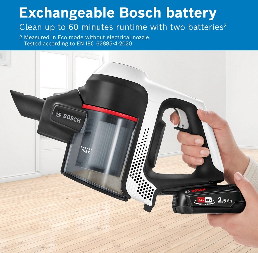 The Bosch BCS612GBKIT 30-minute runtime handheld vacuum features a detachable handheld mode that enhances flexibility and control. This mode allows users to switch from floor cleaning to spot cleaning with ease, making it ideal for sofas, stairs, and car interiors. The handheld unit is lightweight and easy to maneuver, providing targeted suction for small messes and confined spaces. With a 2.5Ah battery capacity and a 30-minute runtime, the Bosch BCS612GBKIT ensures you can complete your cleaning tasks without interruption. The handheld mode complements the full-size vacuum, offering a complete solution for diverse cleaning needs.