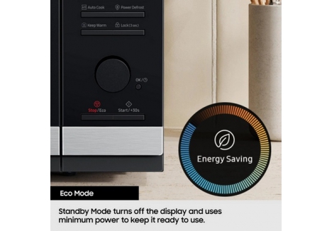 Perfect for busy households and cooking enthusiasts alike, this microwave oven features smart auto cook options that take the guesswork out of meal preparation. With its user-friendly controls and Eco Mode, it ensures energy-efficient operation while maintaining peak performance. The ceramic enamel interior promotes effortless cleaning and minimises the risk of staining and odours, offering both convenience and lasting hygiene. Experience the ease of preparing delicious meals with minimal effort.