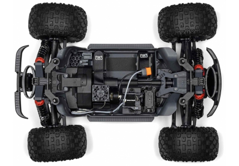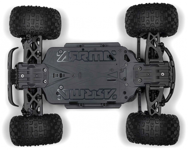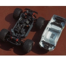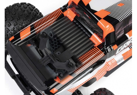 The hidden clipless body retention system on the ARRMA C-ARA4202V4T1 1/10 scale brushed 4WD truck with overload coupler and adjustable suspension is a standout feature for both aesthetics and practicality. Unlike traditional body clips that can be lost or damaged, this system uses concealed mounts to secure the body shell firmly in place. It preserves the aggressive monster truck styling while allowing quick access to internal components for battery swaps or maintenance. This design also reduces wear on the body shell and mounting points, extending the life of your truck’s exterior and improving your overall bashing experience.
