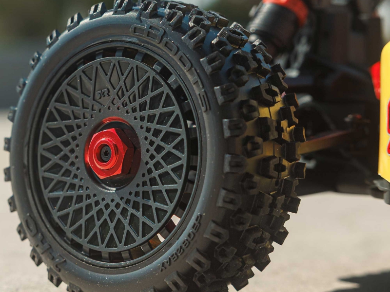 The TYPHON MEGA 665 with dBoots 2-HO tires and waterproof Spektrum electronics is equipped to grip and go. The multi-surface tread pattern on the dBoots 2-HO tires delivers traction across dirt, gravel, and short grass. Vent holes allow air and moisture to escape, improving grip and preventing buildup. The tires are mounted on tough nylon wheels with foam inserts that reduce vibration and enhance handling. Combined with the waterproof Spektrum electronics, these components ensure the ARRMA C-ARA4206V4T2 is ready to bash in any condition with confidence and control.