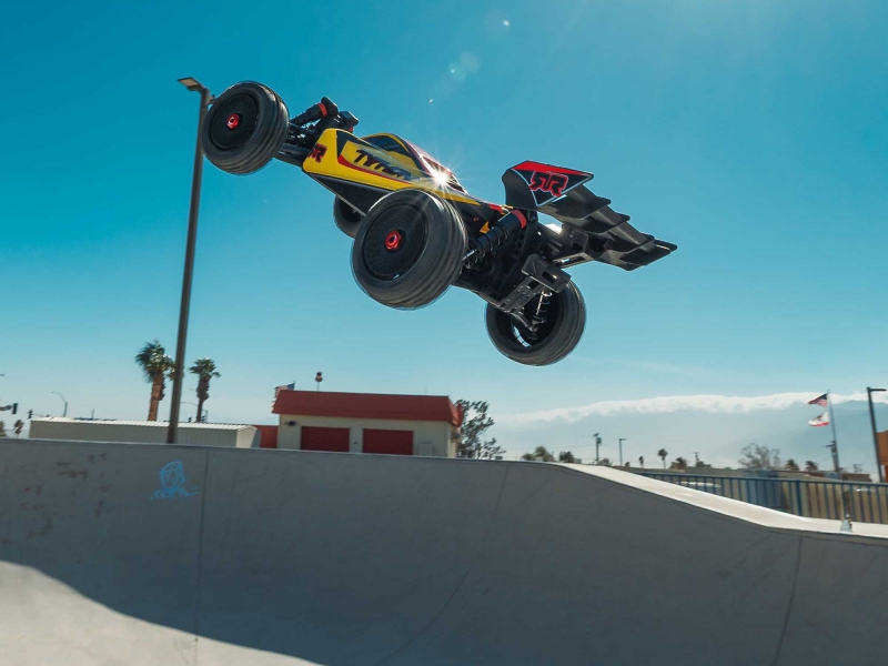 The ARRMA racing buggy with foam-insert wheels and oil-filled coilover shocks is built to take hits and keep going. The oil-filled shocks smooth out rough terrain, while the foam-insert wheels absorb vibration and maintain traction. Impact-absorbing bumpers and a shock tower protector add structural resilience during aggressive driving. The driveshaft stone guard and adjustable battery straps further protect internal components and support varied battery sizes. These features combine to deliver a racing buggy that’s not only tough but also refined in its handling and responsiveness.