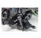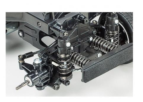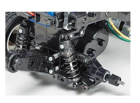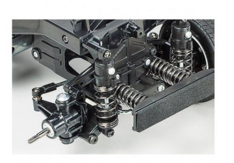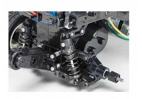 Independent double-wishbone suspension on all four wheels provides reliable damping for everyday runs, while the friction dampers help absorb small bumps. The kit also includes a Tamiya electronic speed controller (ESC), making setup simple and accessible to newcomers, with plenty of room for enthusiasts to upgrade to brushless power or ball bearings for improved performance.