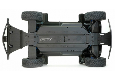 The FTX desert truck with aluminium chassis and dual shock absorbers features a heavy-duty aluminium main chassis designed with a low centre of gravity to reduce roll and improve handling. Reinforced with a front-to-rear top brace, the chassis resists flex and absorbs impact from jumps and rough terrain. Internal wheel well fenders and side guards shield the drivetrain from debris, while front and rear bumpers and skid plates protect against hard landings. This structural integrity ensures the FTX FTX5489BL brushless trophy truck remains stable and responsive even in the harshest conditions.