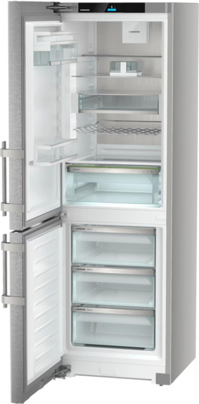 Rated energy efficiency class D under the latest EU guidelines, the Liebherr stainless steel freestanding fridge freezer consumes just 201 kWh/year. Its holiday mode reduces energy usage during extended absences, while automatic defrosting and humidity control further optimise performance. The appliance supports smart home integration via the optional SmartDeviceBox, enabling remote monitoring and control.
