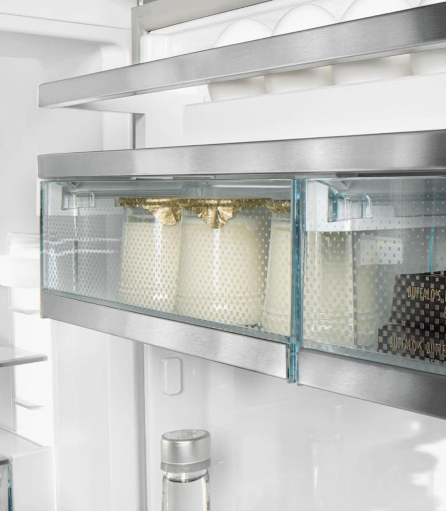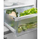 With a total usable capacity of 332 litres, the Liebherr SCNsdd fridge freezer combination offers ample space for fresh and frozen goods. The fridge section includes four safety glass shelves, a bottle rack, and a vegetable drawer on telescopic rails with humidity control. The freezer compartment features three transparent drawers and removable shelves for flexible storage. LED lighting in both compartments ensures full visibility, while the metal rear panel adds a premium touch.