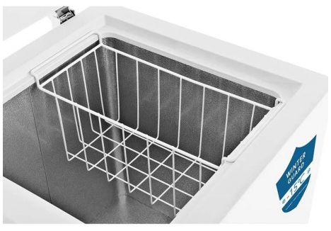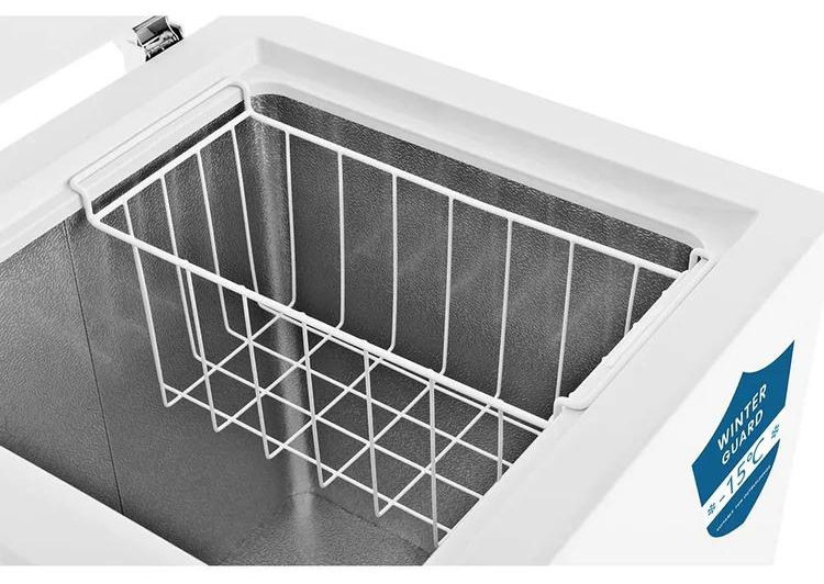 The Teknix CH142 chest freezer with removable wire basket and mark-proof white finish includes a practical internal storage basket that simplifies organisation. Smaller food items such as frozen vegetables, desserts, or frequently accessed goods can be separated from bulkier items stored below. This structured layout reduces the need to search through contents and improves daily convenience. The durable white exterior resists visible marks, maintaining a clean appearance even in high traffic areas.