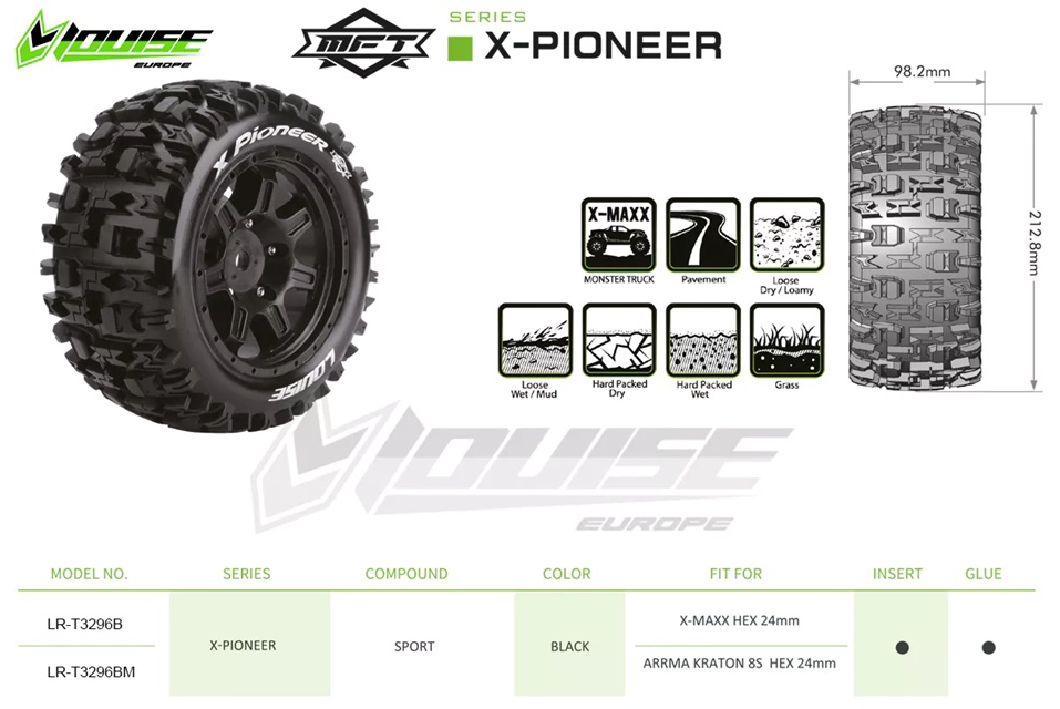 - Product Type: Louise RC L-T3296B X-Pioneer tires for Traxxas X-Maxx 24mm hex, Louise RC L-T3296B mounted sport compound tires with MFT tech, Louise RC L-T3296B black nylon wheels for 1/5 scale X-Maxx, Louise RC MFT tires with micro fiber belt for high-speed stability L-T3296B, Louise RC sport compound tires with foam inserts and glued rims