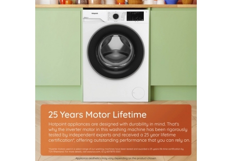 Yes, the appliance boasts an A-30% energy rating, making it one of the more efficient options available. The certified inverter motor is built to last up to 25 years, offering consistent performance with reduced energy consumption. This motor also contributes to quieter operation, with a noise level of just 72 dB during spinning. Combined with a water usage of 49 litres on a standard wash, the Hotpoint washing machine HBWH 93 CARE with SteamCare and inverter motor is both environmentally conscious and cost-effective.