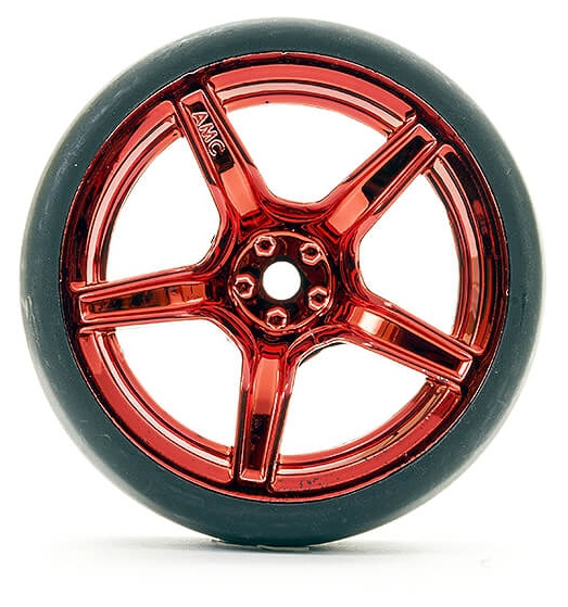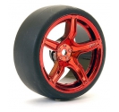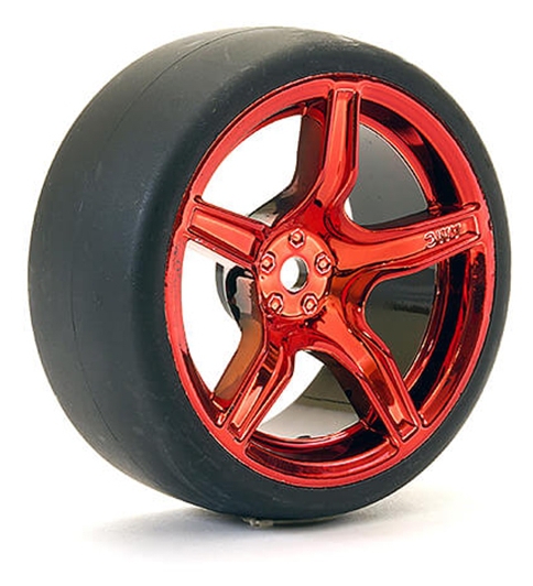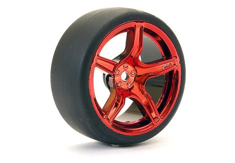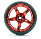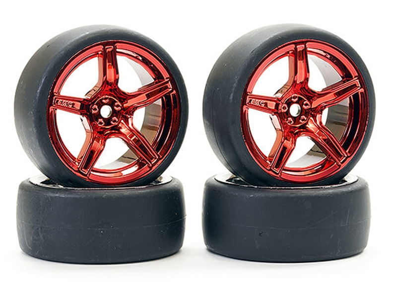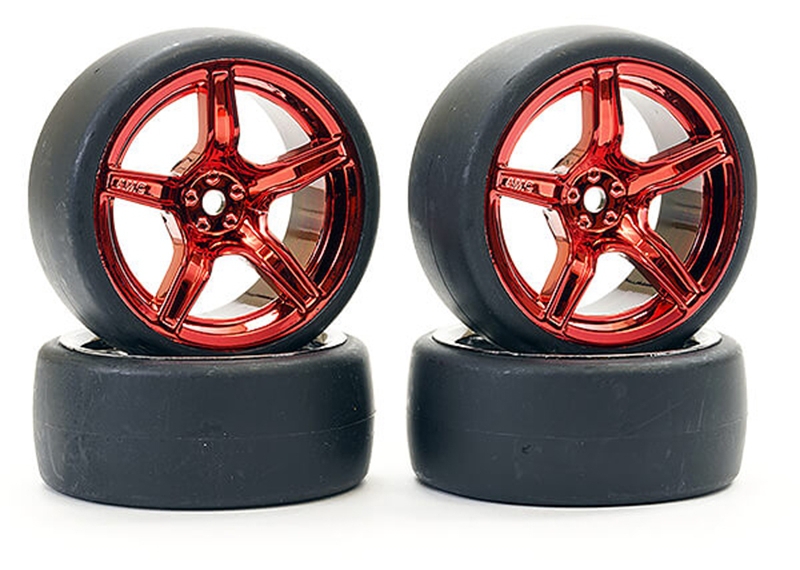 This pre-mounted set puts 1/10 drift-ready performance in your hands. Each of the four wheel-tyre combos features lightweight metallic red 5-spoke alloy wheels and high-grip drift tyres—ideal for aggressive track action.