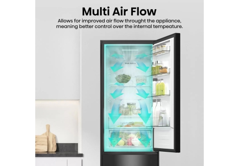 This fridge freezer works silently and efficiently—rated “E” for energy and operating at just 38 dB. Total No-Frost ensures you never need to manually defrost, while Multi Air Flow maintains even cooling from top to bottom.