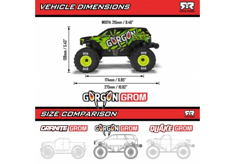 The GORGON GROM isn't just a truck, it's an awakening. Whether it's your first truck or your fiftieth, this mini monster means business. Compact size. Full-throttle fun. Bash harder, faster, and longer, wherever you are. Bone-rattling monster truck mayhem starts here.